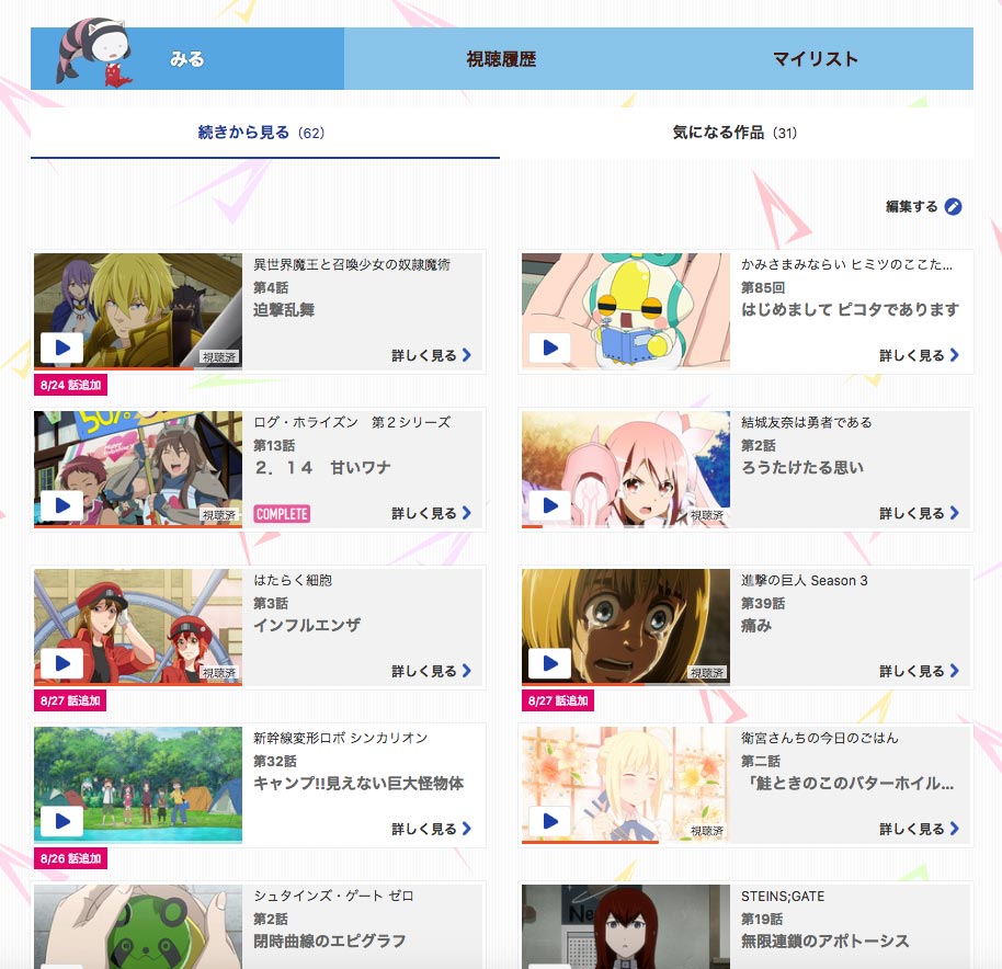 わざわざ前回見ていたページを検索しなくてもいいので便利だし、マイページにお気に入りとして入れる作業とかも必要なく、視聴したものがここに自動で勝手にまとめられていくので便利なんです。