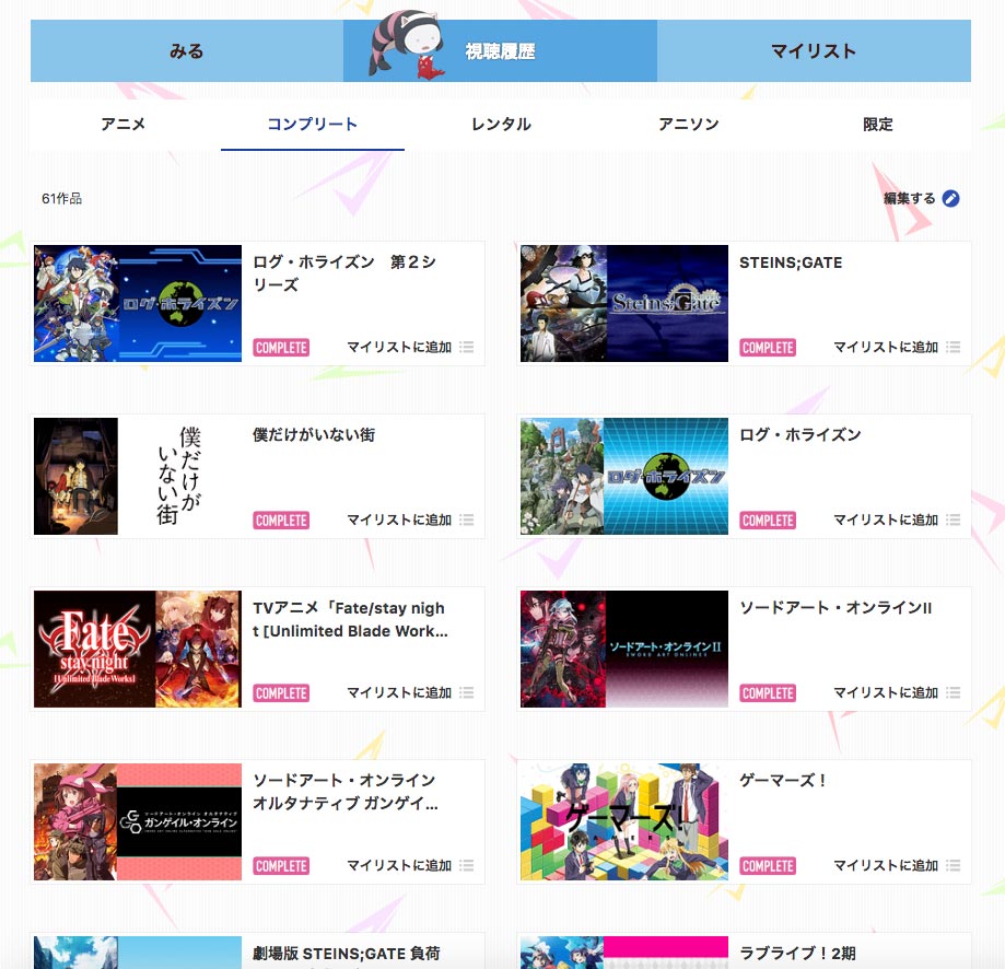 また視聴コンプリートした作品が一覧できるページもあってこれを増やしていきたいと、日々ガンガン見ている感じです。